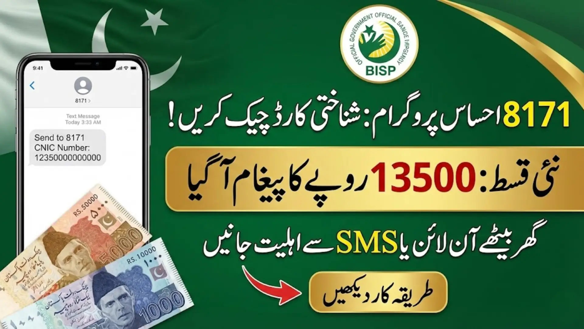 Send your 13-digit CNIC number to 8171 or visit the official web portal to check your eligibility and payment details.