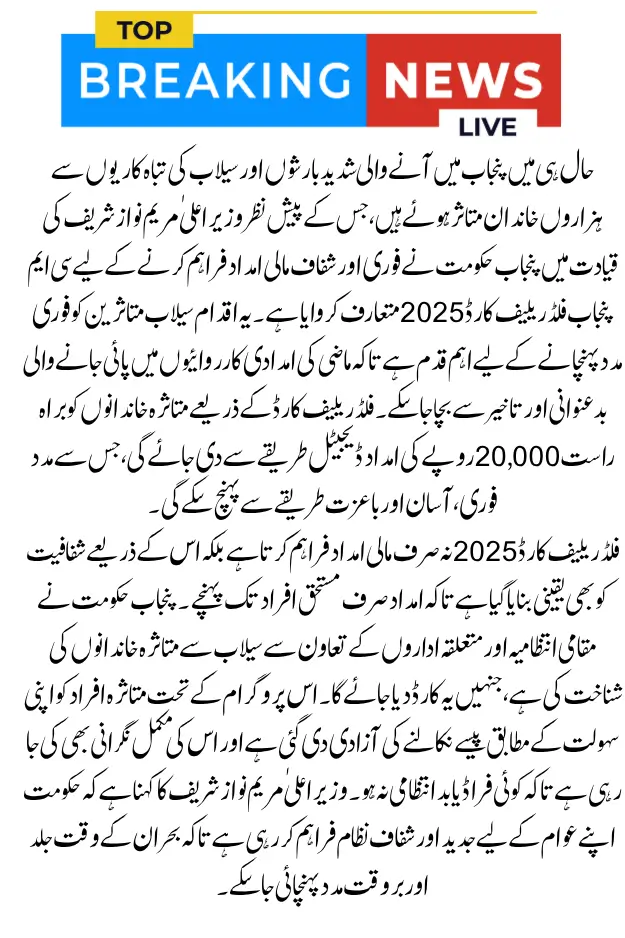 In the wake of the recent devastating floods that have affected thousands of families across Punjab, the provincial government, under the leadership of Chief Minister Maryam Nawaz Sharif, has taken a decisive step to provide swift and transparent financial relief. The launch of the CM Punjab Flood Relief Card 2025 marks a significant move towards ensuring that flood victims receive immediate support without the bureaucratic hurdles and corruption issues that have plagued past relief efforts.